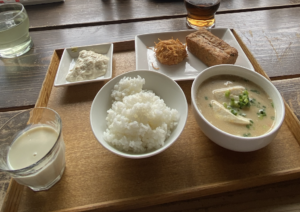 豆汁小、ごはん、おまかせ惣菜1品、できたて豆腐・厚揚げ・豆腐しゅうまいから2品、豆乳のセット🫛
